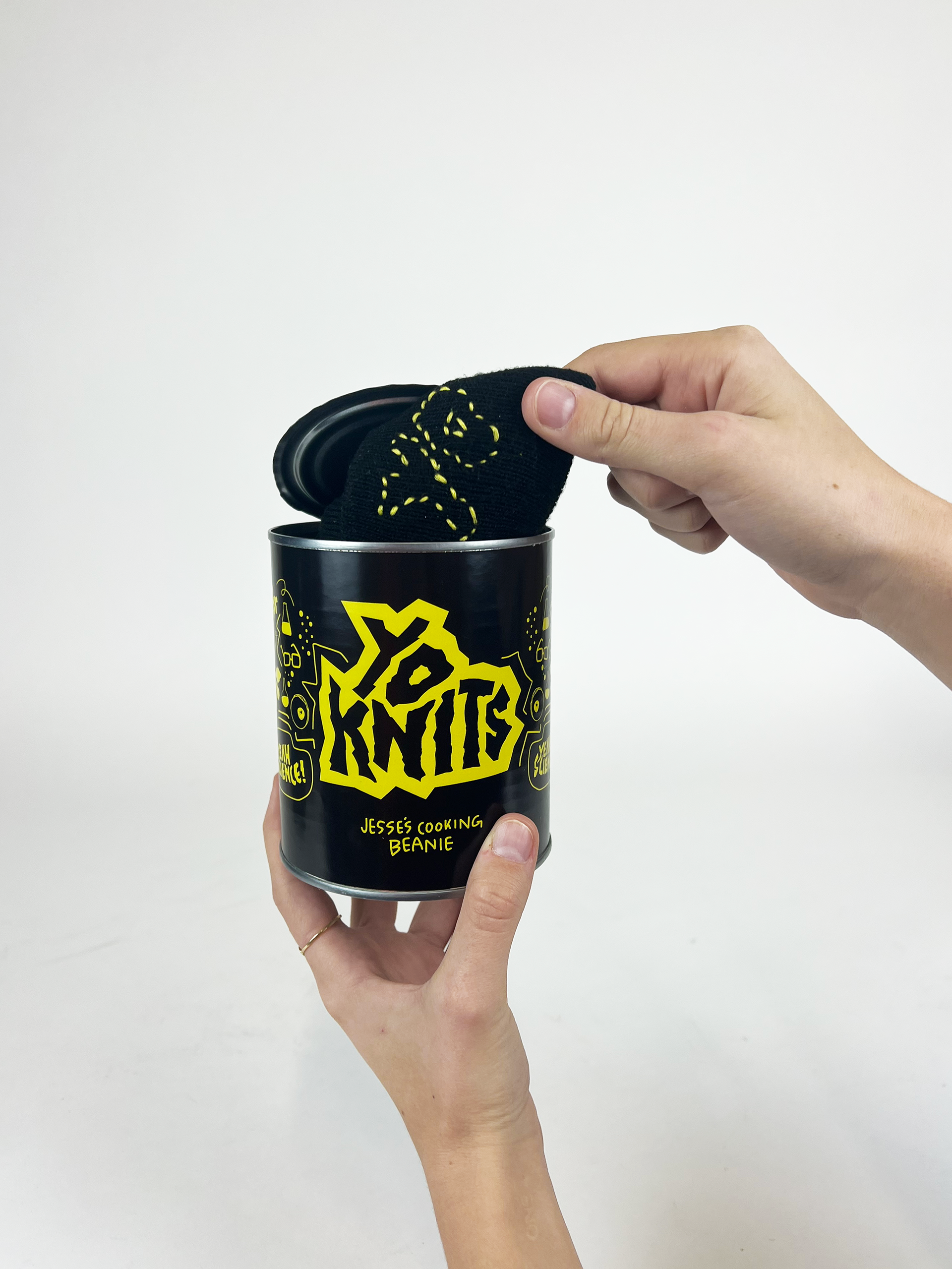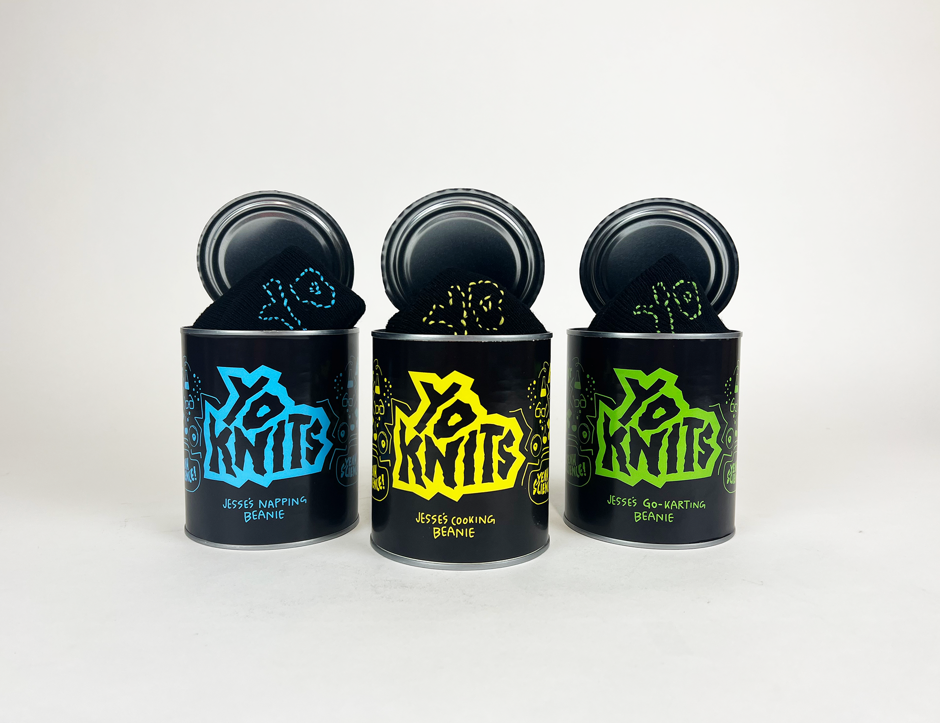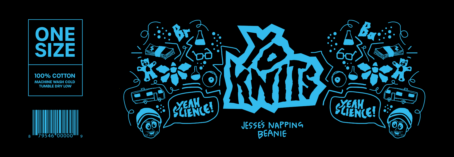 YoKnits is a conceptual line of beanies based on the fictional character Jesse Pinkman from "Breaking Bad." The wrapping of the can was designed with Jesse's character in mind, as it features various elements representative of his personality.
