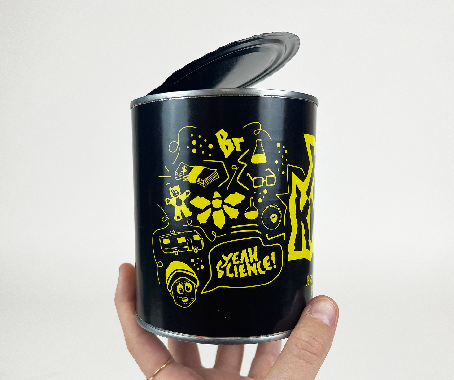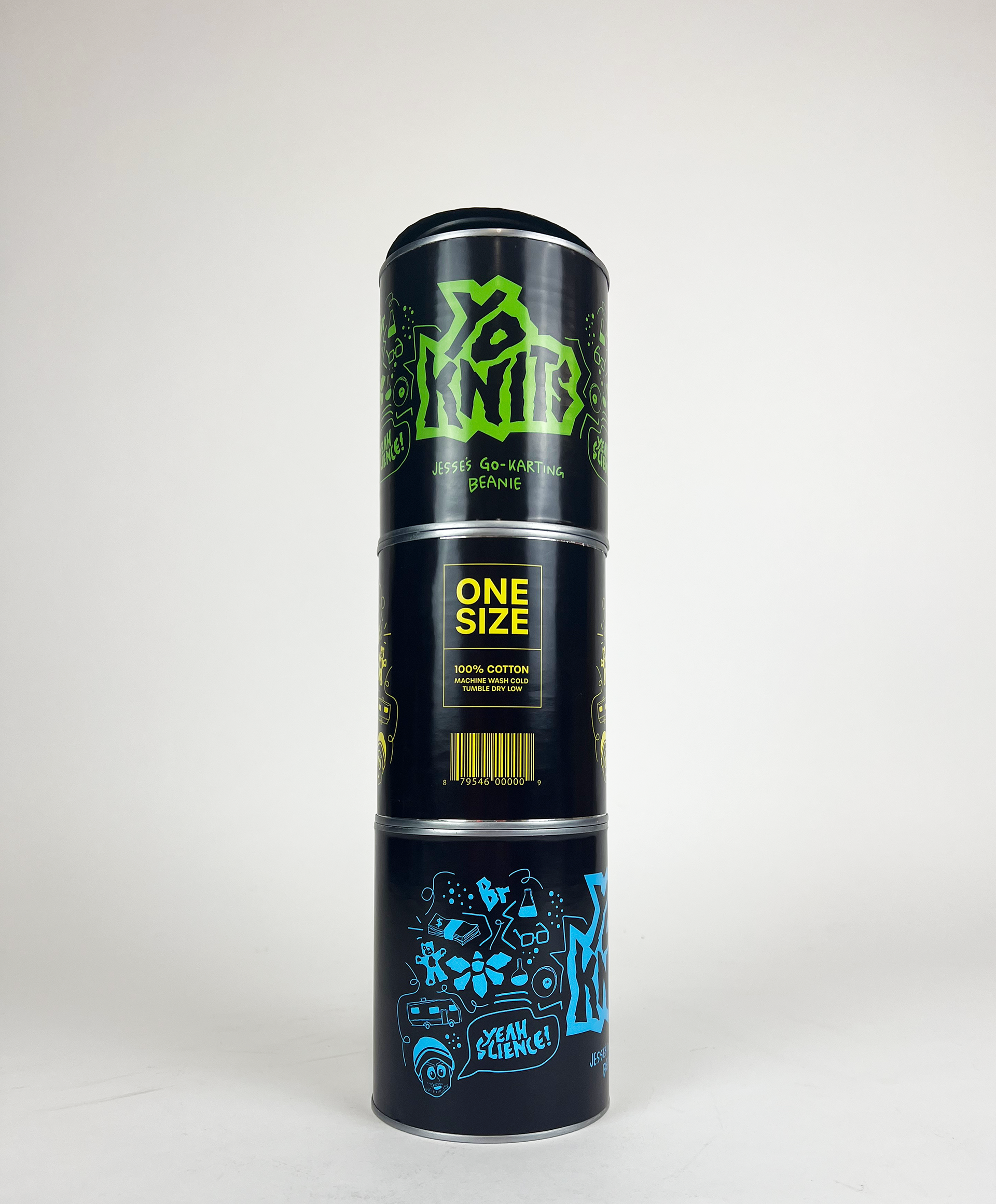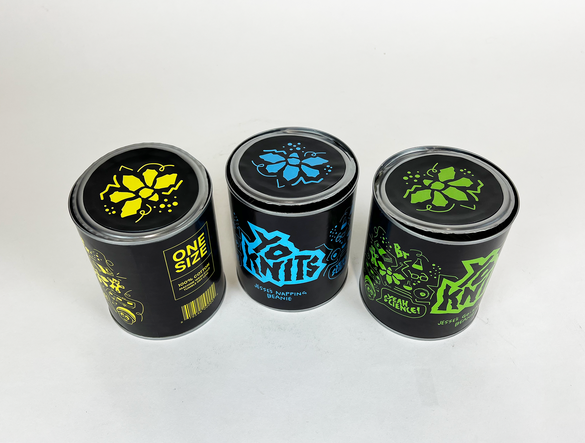 YoKnits is a conceptual line of beanies based on the fictional character Jesse Pinkman from "Breaking Bad." The wrapping of the can was designed with Jesse's character in mind, as it features various elements representative of his personality.
