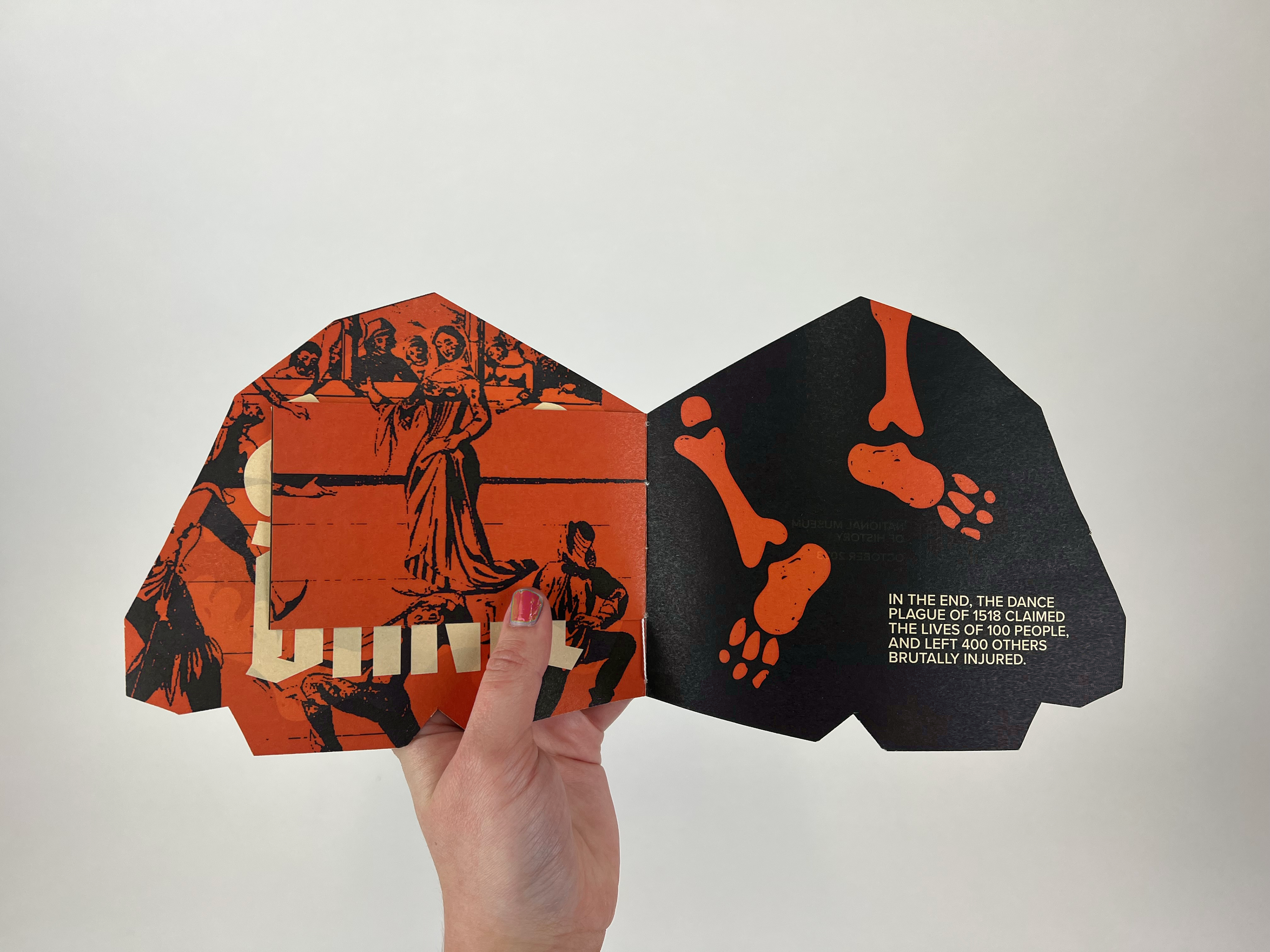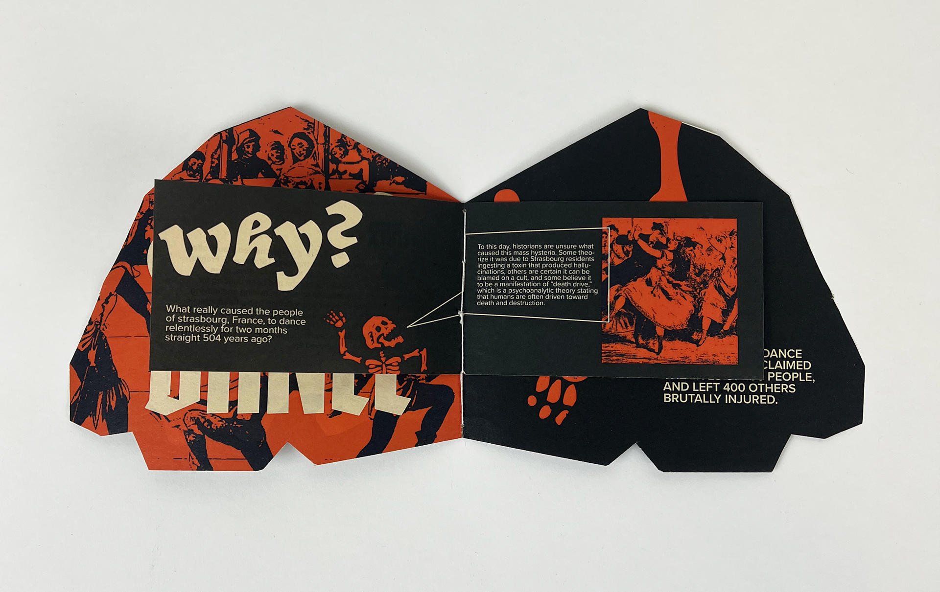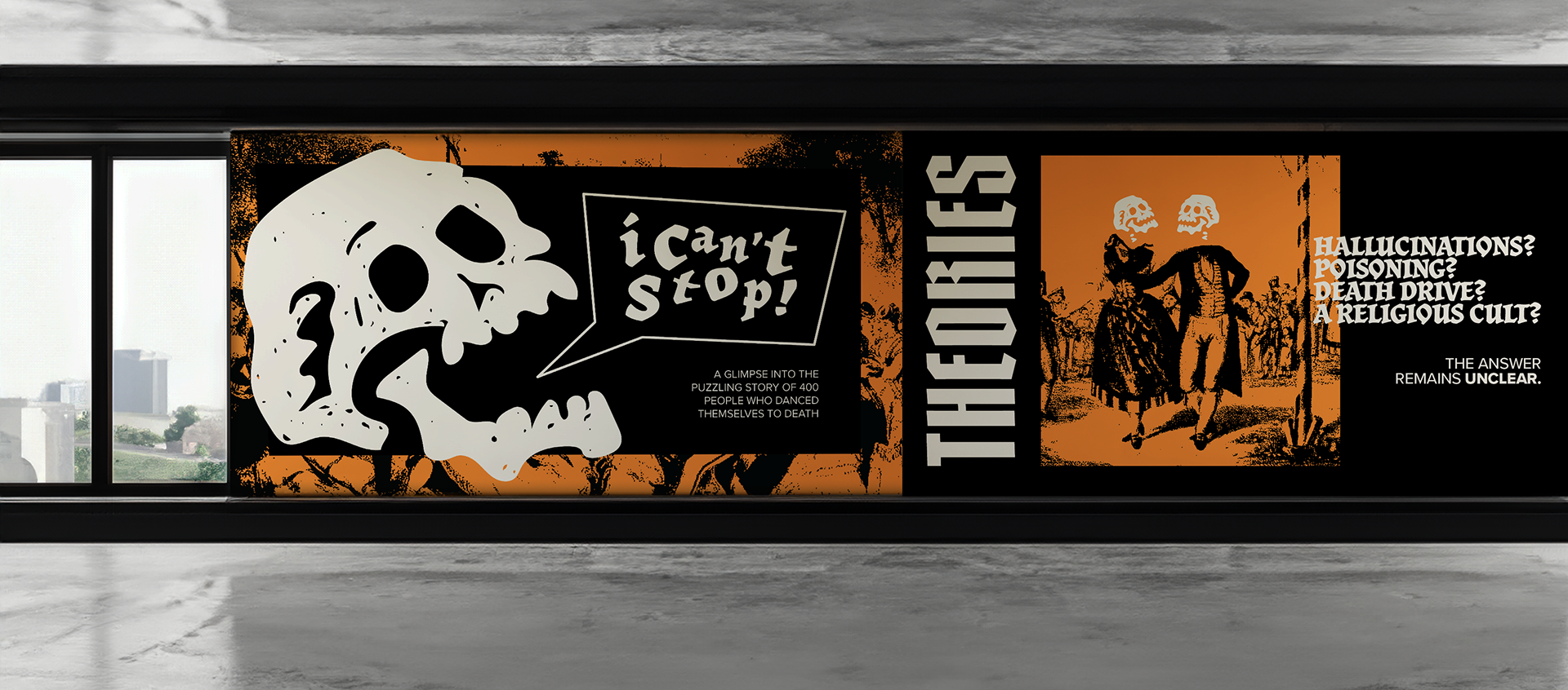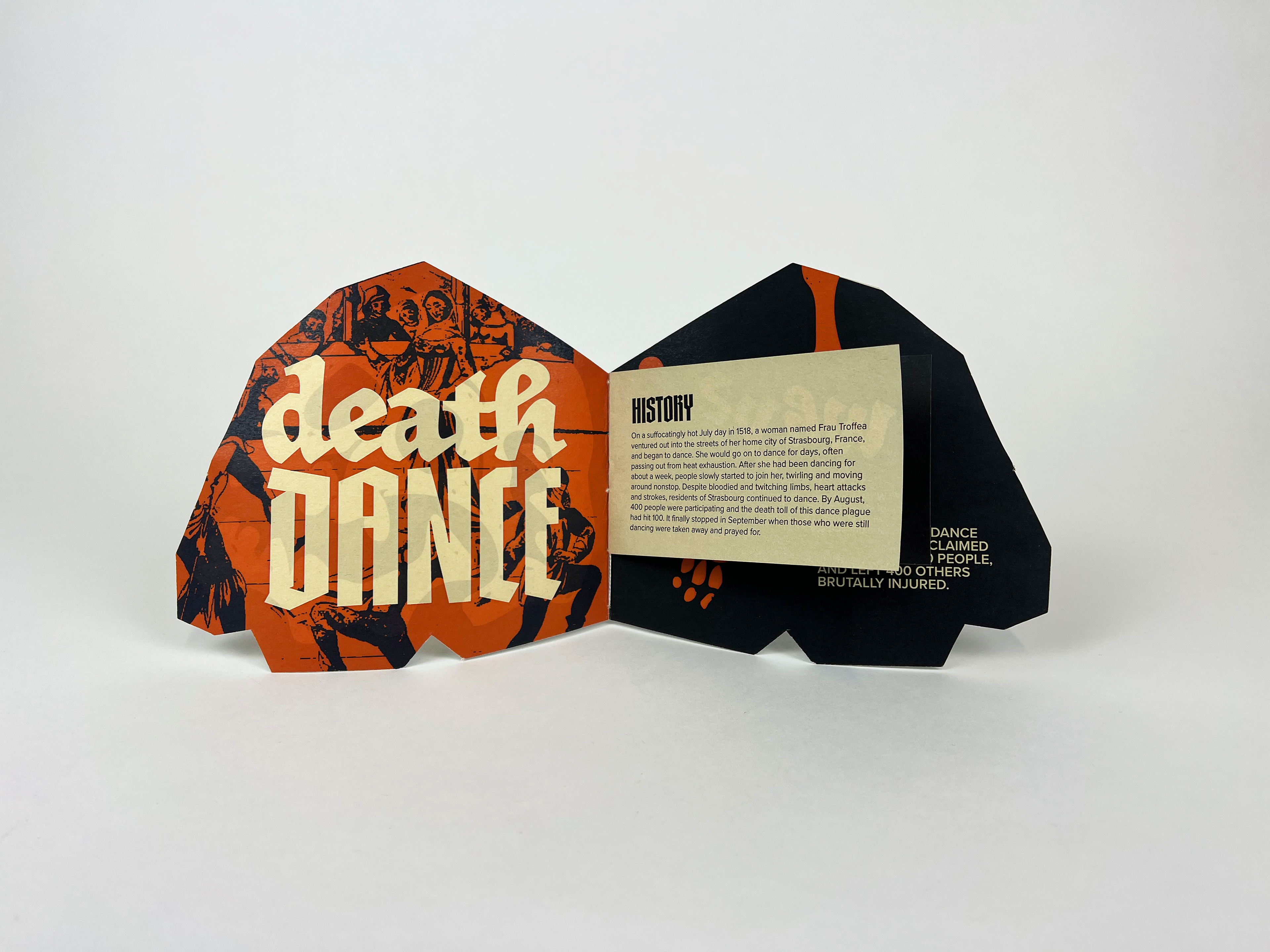 "Death Dance" is a conceptual museum exhibit created to tell the story of the dance plague of 1518, an instance in which hundreds of people danced themselves to death for no apparent reason.